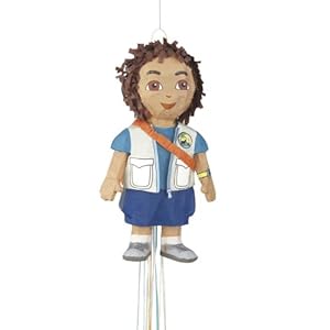 Go Diego Go! Our Diego Pull String Pinata is a great party activity and doubles as a fun decoration. Our Diego pinata is easy to use, measures approximately 10" wide and 18" tall and features green, orange and white ribbons for pulling. Fill with treats of choice (not included) such as wrapped candies or small soft toys, and hang from a sturdy support with a strong rope. Guests take turns pulling ribbons until one ribbon opens the hidden door and releases the goodies. Our pull string pinata is a fun and safe alternative to traditional pinatas.